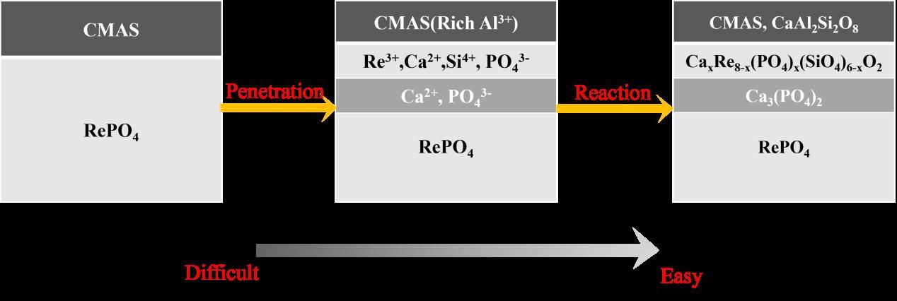 该论文是国家自然科学基金、湖南省教育厅基金等资助的重要成果之一,由孙俊彬副教授和许志锋教授共同指导完成。伟德官方网站为第一署名单位,李利珍为论文第一作者。论文研究结果表明:多组分稀土磷酸盐材料在1250℃和1350℃下经CMAS腐蚀5 h,10 h和20 h后的主要腐蚀产物为磷灰石(Ca2+xRe8-x(PO4)x(SiO4)6-xO2)和Ca3(PO4)2,由Ca3(PO4)2组成的P-Ca层可阻止熔融CMAS的进一步渗透。与其他稀土离子相比,La3+更难与CMAS形成磷灰石。因此,降低La元素含量和稀土离子半径差有望成为提高多组分稀土磷酸盐材料抗CMAS性能的新途径。