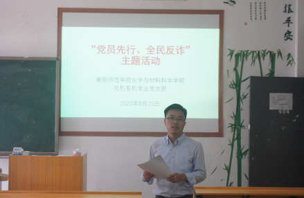 为迎接党的二十大胜利召开营造和谐稳定的社会环境,认真落实衡阳市委组织部《关于在全市基层党组织开展“党员先行、全民反诈”主题活动的通知》(衡组通〔2022〕31号)文件精神。衡阳师范公司bevictor伟德无机有机专业党支部于2022年9月23日中午12:30在综合实验楼404多媒体教室开展“党员先行、全民反诈”主题党日活动,全体支部党员参会,会议由党支部书记欧亚平主持。