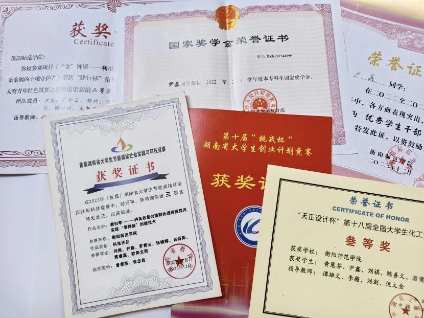 在第十届“挑战杯”创业计划竞赛中,尹鑫团队的PPT曾因视觉单调被指出缺陷。她没有选择回避,而是带领团队熬夜重做20版设计,将数据可视化图表融入化学分子结构;项目书修改47次,把实验数据编织成逻辑网。赛场上,面对来自全省各大高校的众多杰出团队,尹鑫及其队友们毫不畏惧。在指导老师的悉心指导下,团队成员紧密协作、配合默契,发挥出扎实的专业素养与出色的临场发挥。正是这种“科研强迫症”,让她们斩获省级铜奖。大二时,尹鑫在实验室里投身于上千组数据的分析工作,她的勤奋和专注让她在科研的道路上快速成长。尽管因熬夜分析数据体重减轻了10斤,但她却以第二作者的身份在SCI二区期刊上成功发表论文,并积极参与了6项发明专利的申请。这些科研成果不仅是对她个人努力的肯定,更是对她团队协作和创新精神的认可。“那些熬夜赶报告的疲惫,都在获奖证书拿到手的那一刻变成了星星。”她笑着说。