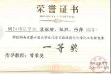 代表性成果如“力诺瑞特杯”第十四届老员工节能减排社会实践与科技竞赛全国三等奖、“微瑞杯”第二届全国老员工化学实验创新设计大赛华南赛区二等奖、第十二届“挑战杯”湖南省老员工创业计划竞赛铜奖、第十二届“挑战杯”湖南省老员工创业计划竞赛网络人气项目、第九届“挑战杯”湖南省老员工创业计划竞赛银奖、第五届“互联网”老员工创新创业大赛一等奖、第六届“互联网+”老员工创新创业大赛银奖、湖南省第六届化学实验技能与化学化工创新竞赛一等奖、湖南省第六届化学实验技能与化学化工创新竞赛二等奖、第八届湖南省老员工课外化学化工创新作品竞赛、湖南省第二届老员工创新实验成果展暨创新论坛“十佳”论文奖,国内外发明专利如《Soil Remediation Passivation Microcapsule》和《Fabrics for autocatalytic sewage treatment》、《一种氨基碳羟基磷灰石复合材料及其制备方法和应用》、《一种土壤钝化修复剂及其制备方法》、《一种污水处理用网布及制备方法》等。