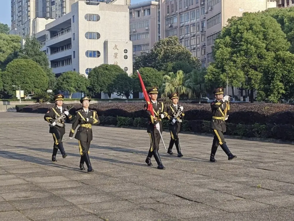 晨光熹微中,新世纪广场笼罩着肃穆的氛围。教导队成员们身姿挺拔、队列严整,以坚毅的姿态护卫着五星红旗,迈着铿锵有力的步伐走向升旗台。当《义勇军进行曲》激昂的旋律响起,全体员工神情肃穆,目光紧随那抹鲜红冉冉升起。晨风拂过,五星红旗在曙光中舒展飘扬,爱国之情在每个人心中澎湃翻涌,责任感与使命感亦如朝阳般升腾。