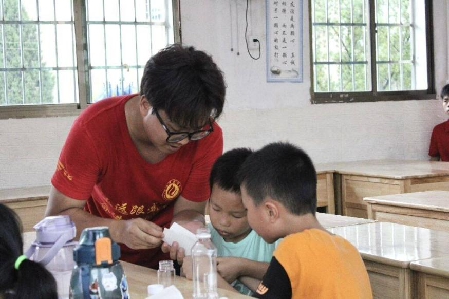 (志愿者指导孩子们做化学实验)