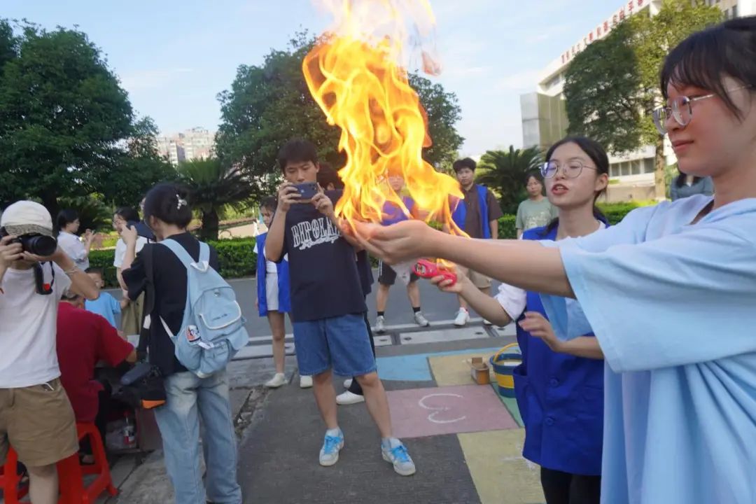 同学们穿梭于各个展位之间,有的认真聆听志愿者的讲解,了解化学元素的奥秘;有的则动手参与实验,亲自感受化学反应的奇妙。知识闯关区设置了化学方程式配平、元素周期表拼图、化学知识问答等与化学相关的趣味问题,动手体验区更是吸引了众多员工的目光,不同形状的火焰掌、烧杯里呈现的樱花雨、喷涌而出的大象牙膏等实验现象,激发了同学们的参与热情,他们大胆尝试,体验着化学的魅力。此外,同学们在非遗糖画、非遗漆扇展位中制作了一个个不同的元素糖画,一把把美轮美奂的漆扇,收获着劳动的欢乐。尽管活动持续近三个小时,九大展位的志愿者们认真坚守好岗位,传递着化学人的热情和智慧。火焰掌展位负责人曾冰艳同学感慨道:“看到同学们在我们的指导下,成功在手上比划出各种形状的火焰露出的笑容时,我也很开心!”