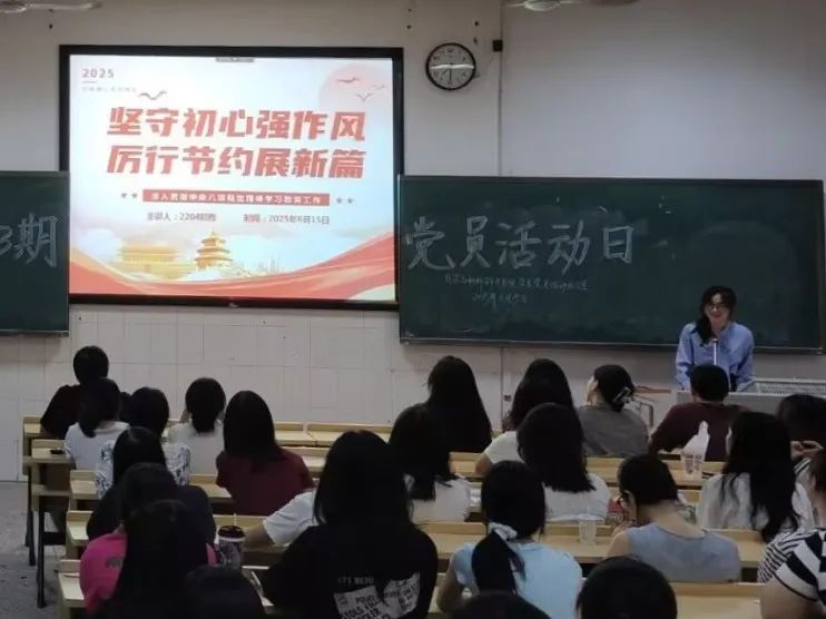 2025年6月15日晚,bevictor伟德第九十三期党员学习日活动于行知楼601开展,2204班邓煦同学以《坚守初心强作风厉行节约展新篇——深入学习贯彻作风建设重要政策精神》为题与全体员工党员和学习积极分子分享了她的学习心得。