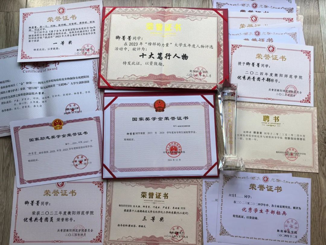 凭借不懈的努力与坚定的执着,卿菁菁收获了优异成绩。国家奖学金、国家励志奖学金、校级优秀共青团员、优秀员工干部标兵、伟德官方网站2023年度“十大笃行人物”等荣誉称号纷至沓来。这些荣誉不仅是对她学业成果的高度认可,更是激励她持续奋进的强大动力。