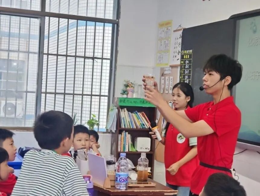 (图为志愿者给孩子们演示简易净水器净水过程)