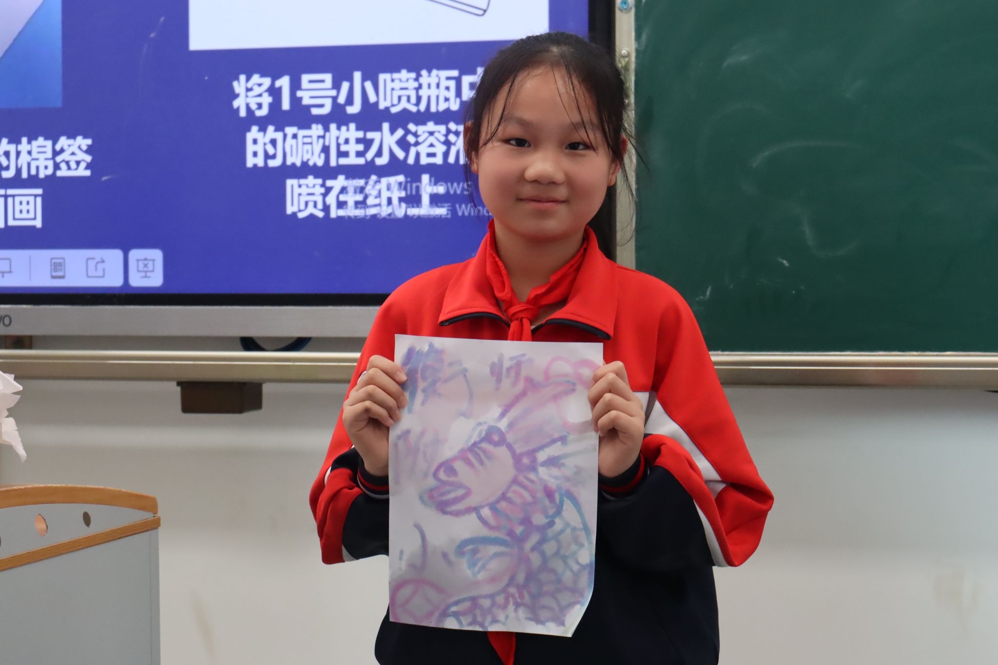 “大家喜欢化学魔术吗?”,志愿者肖峻彬用“化学魔术”一词激发了小员工们的课堂兴趣。紧接着,志愿者邓煦给一朵白色纸花喷上透明的“魔法药水”后,“白花”瞬间变成了“红花”,这一现象令小员工们兴奋不已。志愿者趁热打铁,在白纸上又喷上“魔法药水”,一条生动可爱的红色小神龙便跃出纸面。为了满足孩子们的好奇心,志愿者们便让孩子们分组一起参与趣味科学实验《召唤神龙》。“首先,拿起一根棉签蘸取1号‘魔法药水’在白纸上画上神龙图案。然后……。”经过志愿者们的耐心指导,孩子们在白纸上召唤出了自己的神龙。“这是为什么呢?”孩子们一个个好奇地询问。原来,这是酸碱指示剂的神奇作用,志愿者对实验的科学原理进行了解释,孩子们这才恍然大悟。活动的尾声,志愿者们给孩子们分发了在实验室自制的手工皂作为小奖品,激励孩子们要努力学好科学,用科学改变生活,用科学创造未来。下课铃声响起,孩子们却迟迟没有离开教室,他们一个个围绕着讲台,认真地询问各种问题,并表示十分期待下次上课的内容。