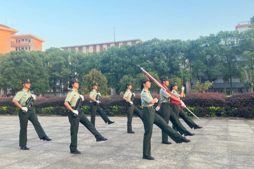 “护迎国旗!”教导队成员们以整齐划一、稳健有力的步伐步入会场,他们的眼神中透露出坚毅与决心。在同学们的热切注视下,他们庄严地将国旗护送至升旗台,彰显了对国家无尽的忠诚与热爱。国歌奏响,鲜艳的五星红旗伴随着雄壮的义勇军进行曲冉冉升起,在这庄严的时刻,全体员工肃立,齐声高唱国歌,并向国旗行注目礼,红旗沐浴着朝阳,飘扬在新世纪时代广场的上空,这一刻庄严而神圣,爱国之情在每一个同学心中澎湃激荡。