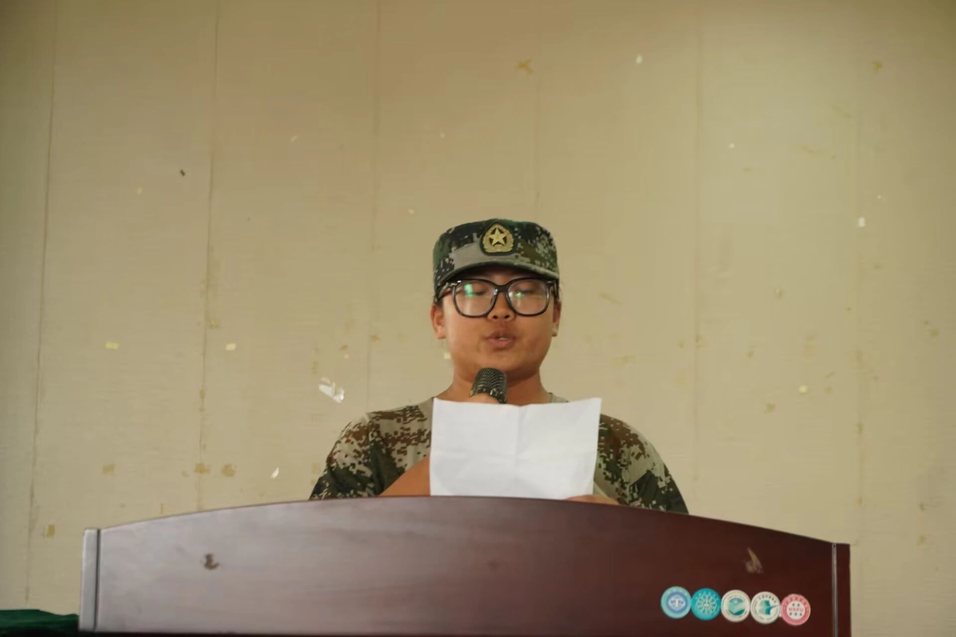随后,军训优秀学员代表张彤与教官代表童朋宇分别发言。张彤回顾了二十一天的军训生活,强调其价值在于考验体能与毅力,塑造精神风貌,铸就坚韧品质。同学们学会了面对困难不屈不挠,相互扶持,加深了对党和国家的热爱与忠诚。